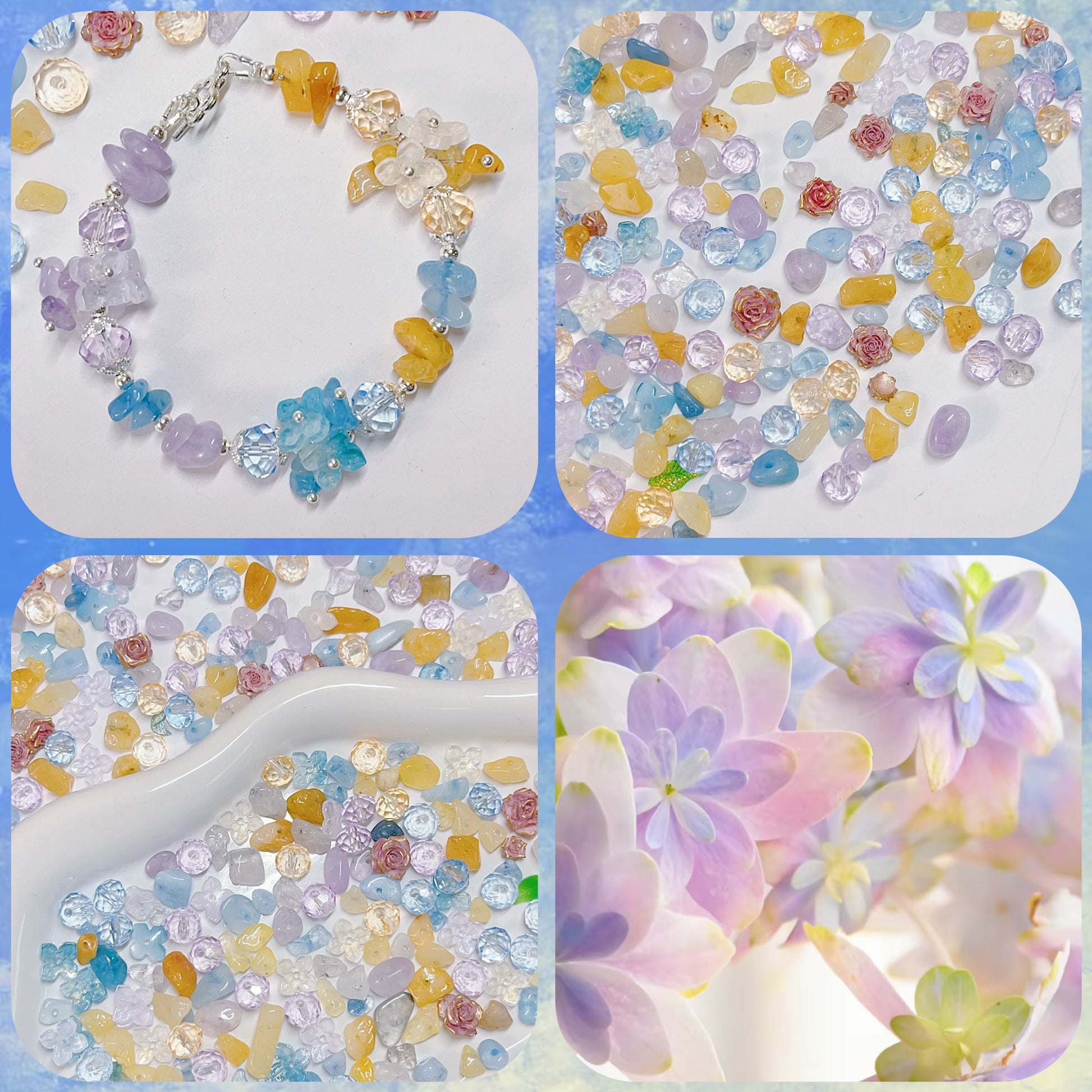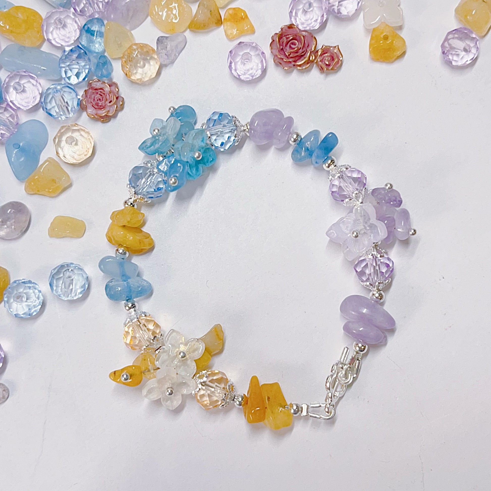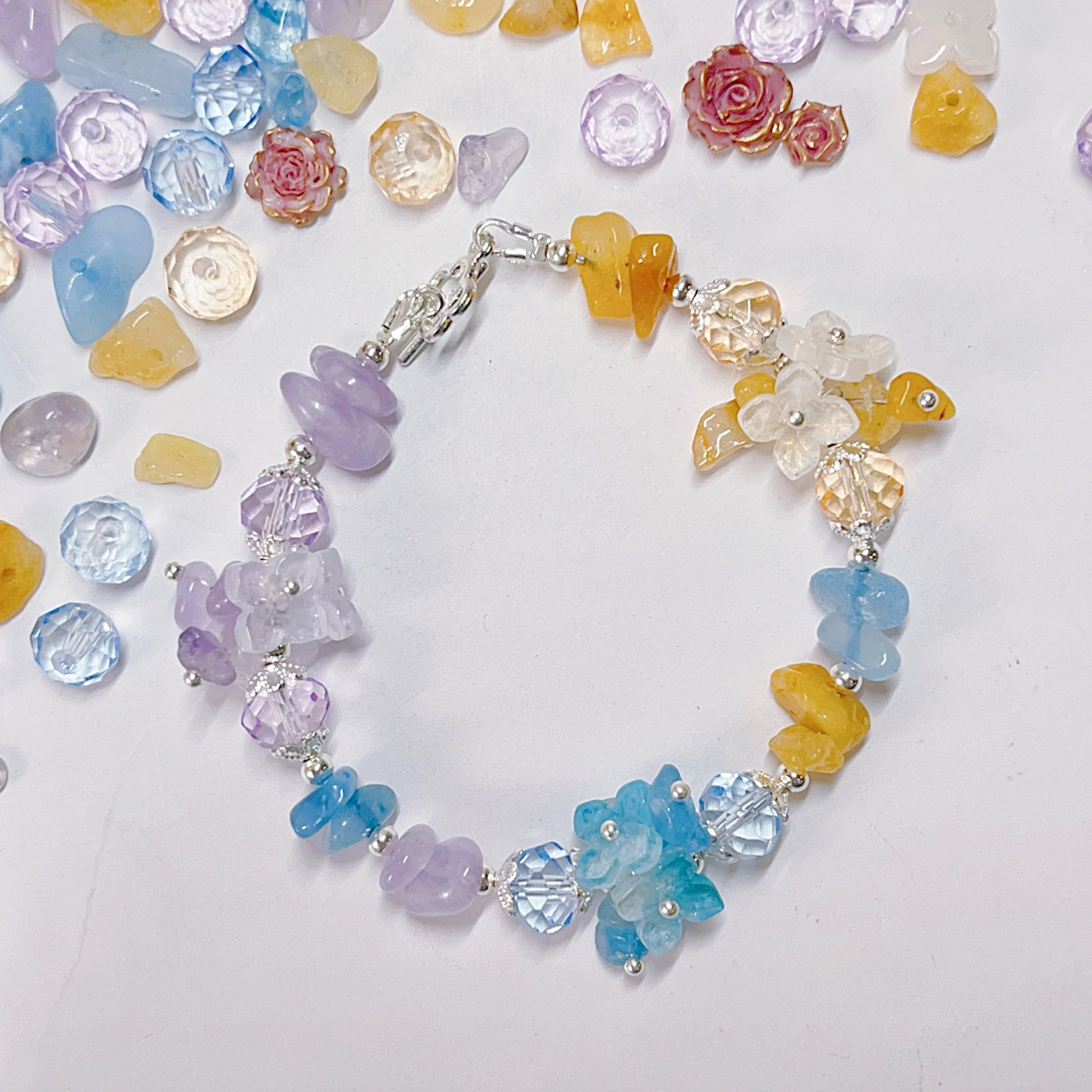 【BZ 432】咲く花ー天然石(イエローアベンチュリン&紫玉髄&アクアマリン)&さざれ石&ガラスビーズ&スターライトビーズ&柔らかい素材フラワー(夜光)