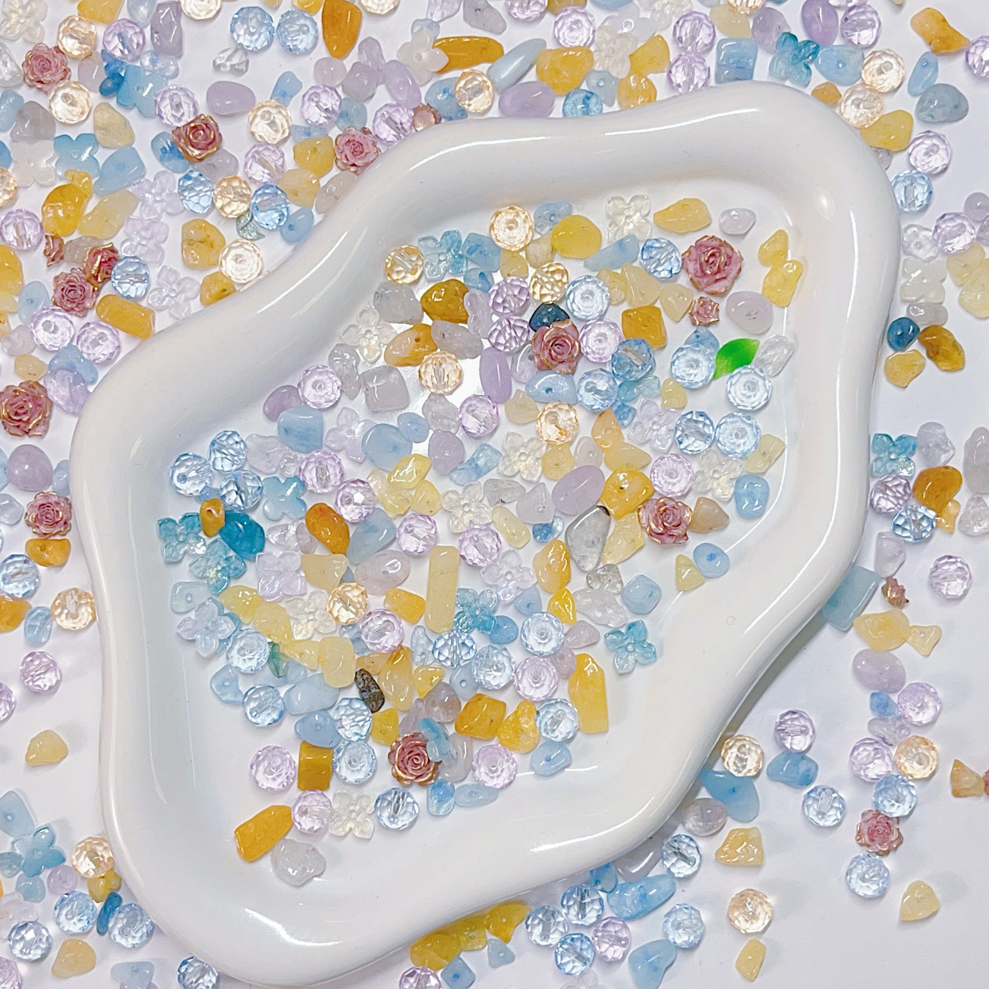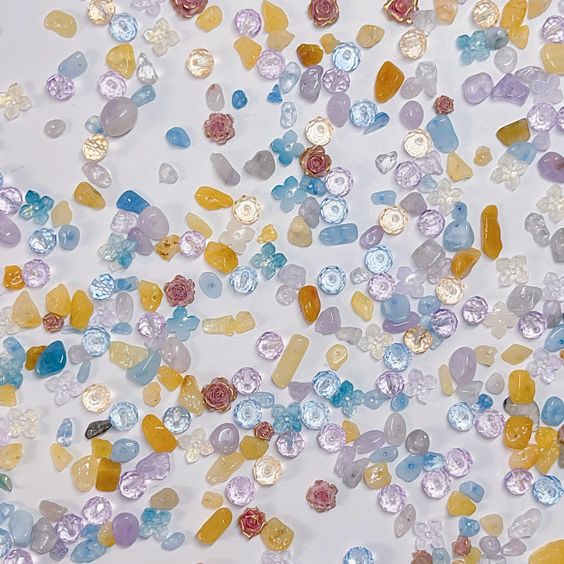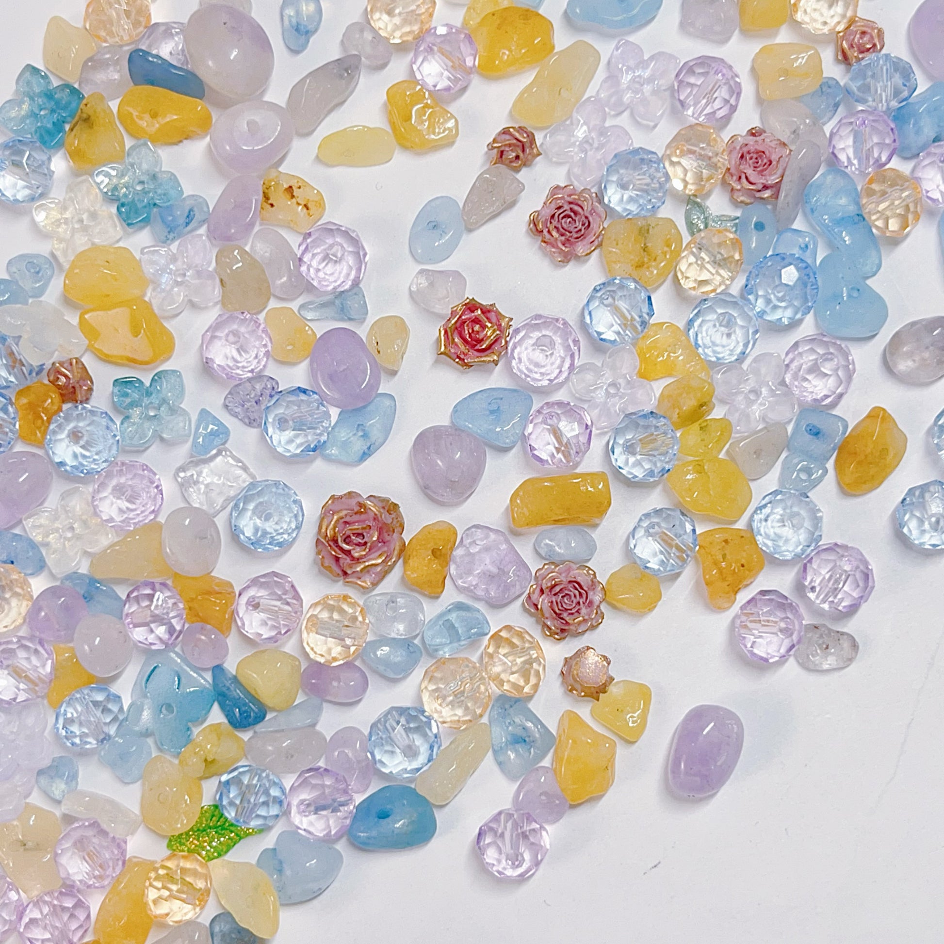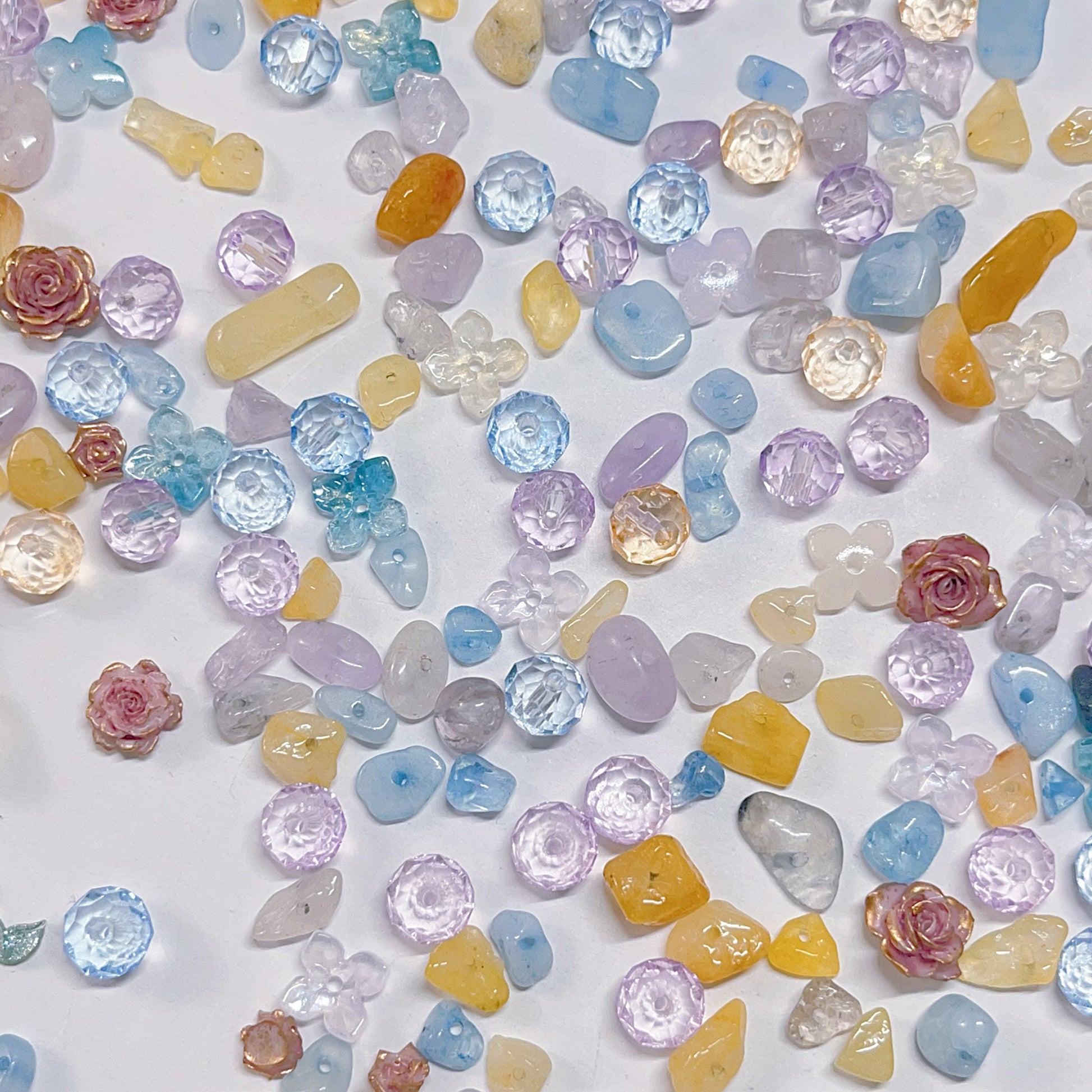 【BZ 432】咲く花ー天然石(イエローアベンチュリン&紫玉髄&アクアマリン)&さざれ石&ガラスビーズ&スターライトビーズ&柔らかい素材フラワー(夜光)